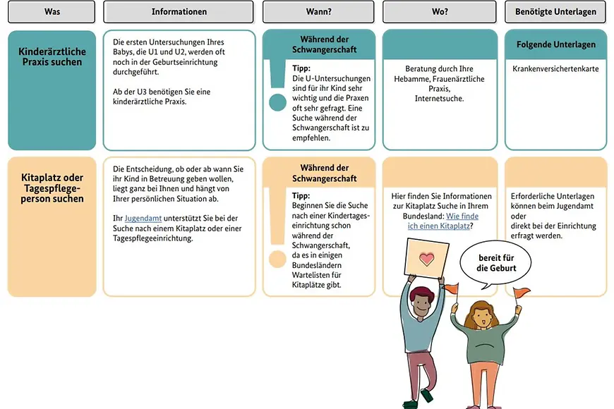 Von der Frage „Wann informiere ich meinen Arbeitgeber?“ über die Suche einer Hebamme und einer Geburtsklinik bis zur Registrierung der Geburt beim Standesamt und Beantragung staatlicher Leistungen: Mit den Checklisten findet sich nun alles, an was rund um Schwangerschaft und Geburt gedacht werden muss, zentral an einem Ort mit weiterführenden Informationen und Links versammelt. Sie enthalten ausführliche Informationen und hilfreiche Tipps. Es gibt eine Checkliste für werdende Eltern, die alles enthält, an was vor der Geburt gedacht werden muss und eine Checkliste für junge Eltern, mit allem, was nach der Geburt in die Wege zu leiten ist.